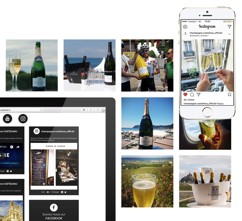 Champagne Castelnau a fait appel à OuiBeat pour développer un espace dédié à sa communauté sur son site web. Une solution basée sur notre Social Wall Web a été mis en place. Ceci afin d’engager la communauté de la marque et de diffuser du contenu issus des réseaux sociaux sur son site web. Un produit entièrement adapté à l’identité de la marque. Incorporé à la fois sur la page d’accueil et dans la rubrique “actu”.